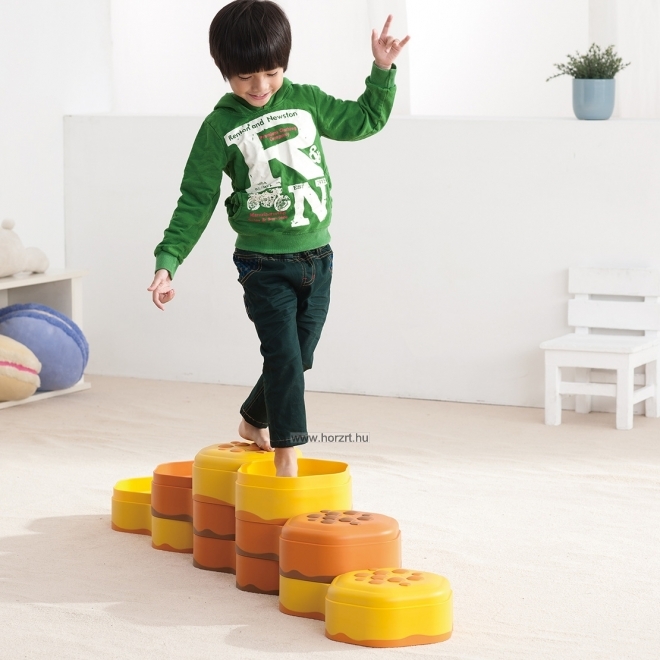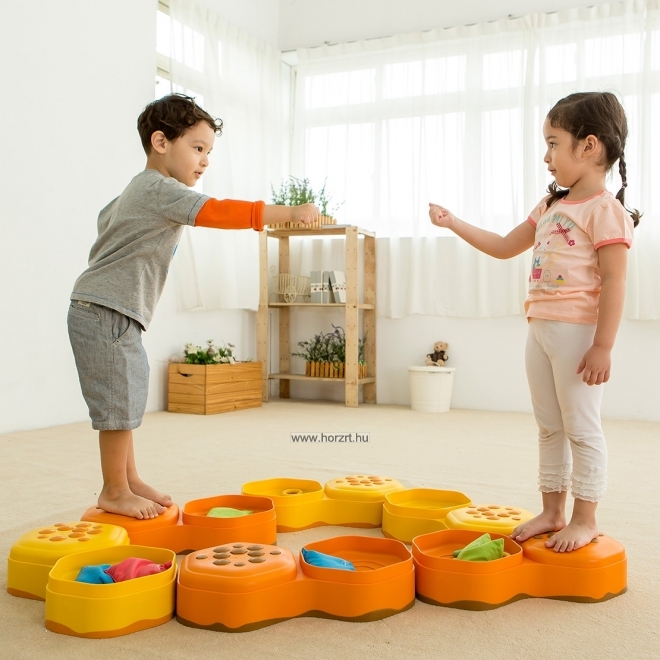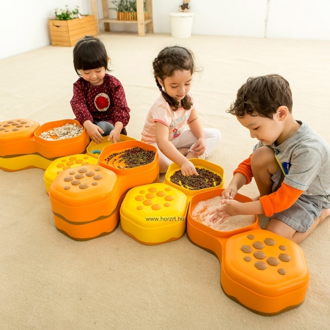 Mozgásfejlesztő eszközkészlet. A méhsejtek természetes formája által ihletett érzékelő ösvény egyesíti az egyensúlyozó- és a tapintás-érzékelésfejlesztő tulajdonságokat. Különféle magasságú és változatos irányú útvonalak alakíthatóak ki segítségükkel. Tartalma: 6 db dupla méhsejt forma (sárga és narancs színben). A dupla hatszög egyik darabja domború és enyhén kiemelkedően pöttyös mintás, a másik darabja süllyesztett, ahová a különböző töltetű zsákokat lehet rakni. 3 db érzékelő tasak, hatszögletű (piros, kék, zöld színben). 2 éves korú gyermekek használatára CE minősítéssel ellátva!