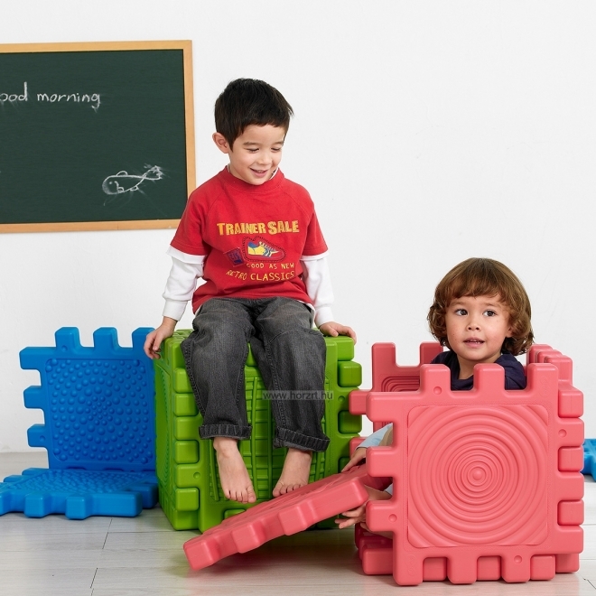 Mozgásfejlesztő eszközkészlet. Nagyméretű elemei különböző érdes felülettel rendelkeznek. Változatos formájú alakzatok építhetők belőlük síkban és térben is, melyek kézzel vagy lábbal történő tapintása fejleszti a gyermek taktilis észlelését. A készlet tartalma: 6 db puzzle-szerűen síkban és térben összeilleszthető elem. Páronként azonos színűek és mintázatúak: zöld - rácsos kék - pöttyös piros - körkörös 6 hónapos korú gyermekek használatára CE minősítéssel ellátva!
