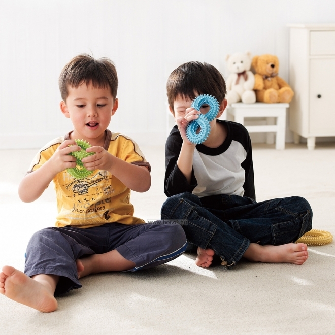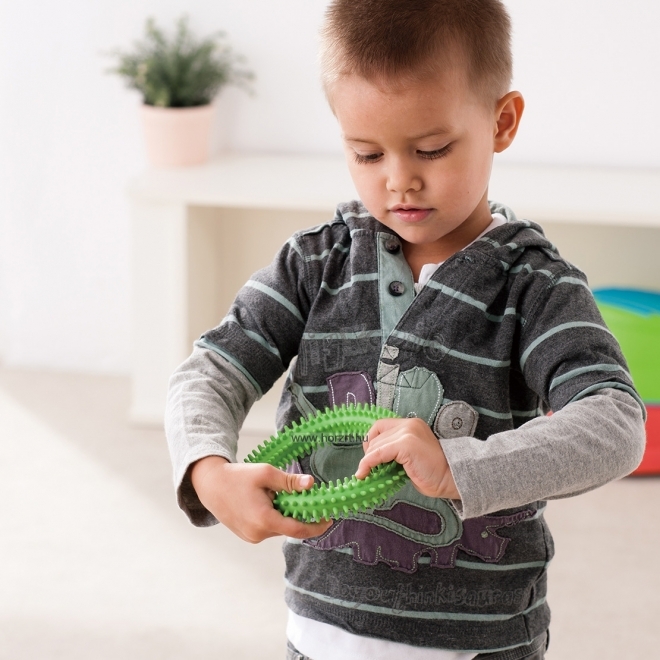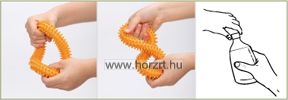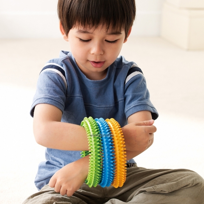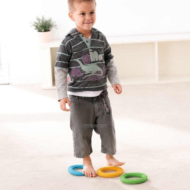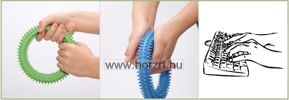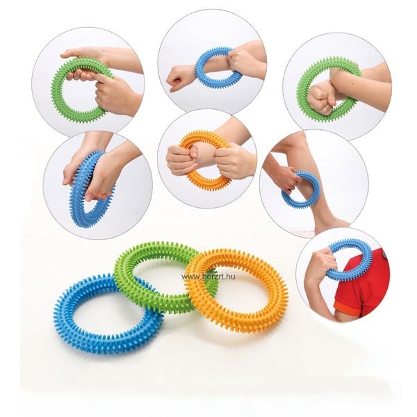 A készlet tartalma 3 db tüskés karika kék, zöld és sárga színben. A készlet 3 különböző erősségű, ellenállási szintű karikát tartalmaz, kék, zöld, sárga színben, ami fokozatosan segíti a gyerekeket és felnőtteket egyaránt a fogási, csavarási és szorítási képességekben. A tüskés felület fokozza a tapintás-érzékelést. A különböző gyakorlatok elősegítik a csuklóízületek rugalmasságát és az alkar erejét. Terápiás foglalkozásokon is alkalmazható.