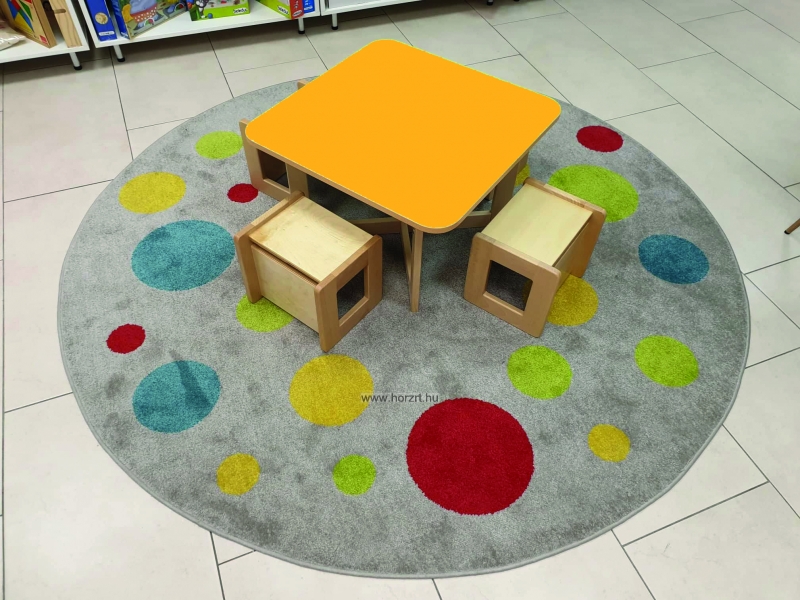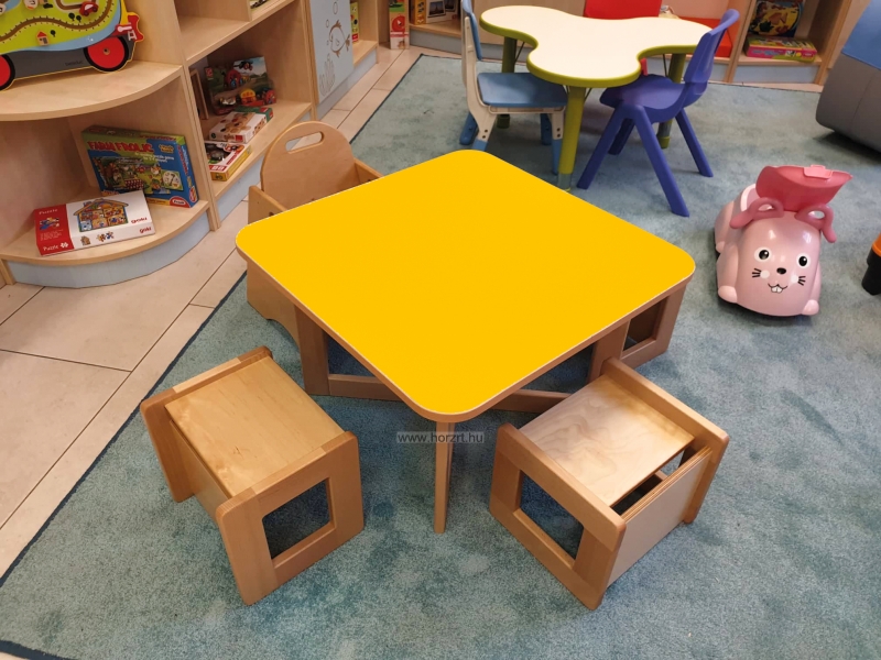 Stílusa megegyezik a hozzá illő, kétállású gyermek ülőkével, gondozónői asztallal, térelválasztóval. Fa, keretes lábai egyedivé és szellőssé teszik a csoportszobát. Mérete: 65x65x40-46 cm - állítható magasság. Az asztal sarkai lekerekítettek, biztonságosak. Előírásoknak megfelel. Lapraszerelt termék.