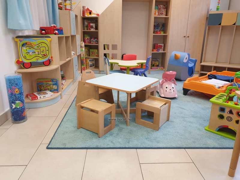 Stílusa megegyezik a hozzá illő, kétállású gyermek ülőkével, gondozónői asztallal, térelválasztóval. Fa, keretes lábai egyedivé és szellőssé teszik a csoportszobát. Mérete: 65x65x40-46 cm - állítható magasság. Az asztal sarkai lekerekítettek, biztonságosak. Előírásoknak megfelel. Lapraszerelt termék.