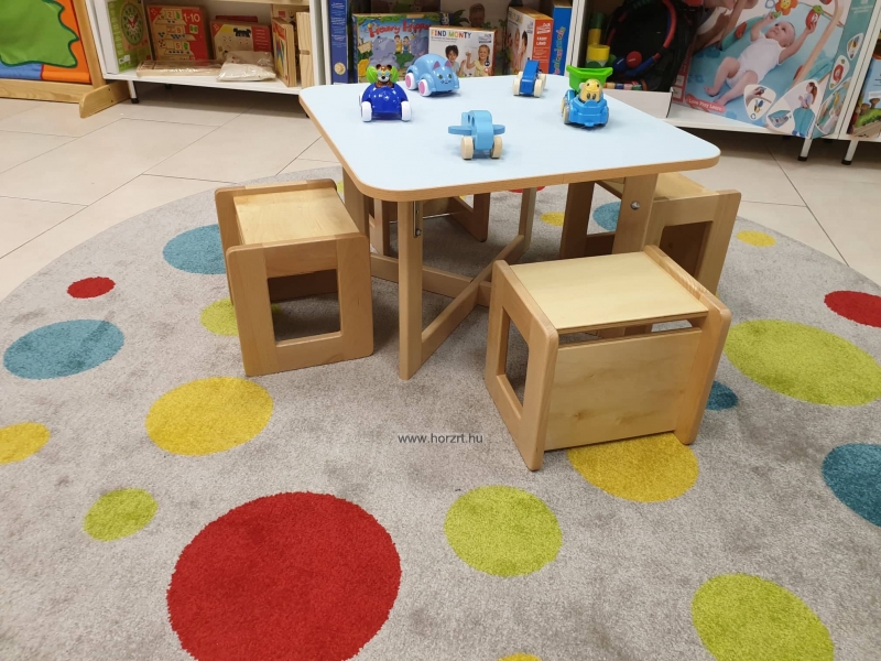 Négyszögletes fa gyermekasztal bölcsődés korosztály részére. Az asztal lapja pasztellkék laminált bútorlapból, a lábai lakkozott tömör bükkfából készülnek. Állítható magasságú.