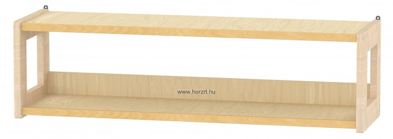 Mérete :90x24x24 cm, Anyaga: laminált bútorlap - keményfa élzárással, tömörfa kerettel. A falipolc stílusa tökéletesen illeszkedik a hozzáilló gyermekasztallal, ülőkével és a gondozónői asztallal. Jellegzetessége az oldalakat lezáró négyszögletes , közepén lukas tömör bükkfa keret. Sarkai lekerekítettek, így rendkívül biztonságosak. Alsó és felső polcára is helyezhetőek az eszközök.Színe: Juharpolcok és bükk lakkozott fa keret.