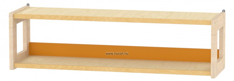 Mérete :90x24x24 cm, Anyaga: laminált bútorlap - keményfa élzárással, tömörfa kerettel. A falipolc stílusa tökéletesen illeszkedik a hozzá illő gyermekasztallal, ülőkével és a gondozónői asztallal. Jellegzetessége az oldalakat lezáró négyszögletes , közepén lukas tömör bükkfa keret. Sarkai lekerekítettek, így rendkívül biztonságosak. Alsó és felső polcára is helyezhetőek az eszközök.Színe: Juhar színű polcok , narancs hátoldal és bükk lakkozott fa keret.