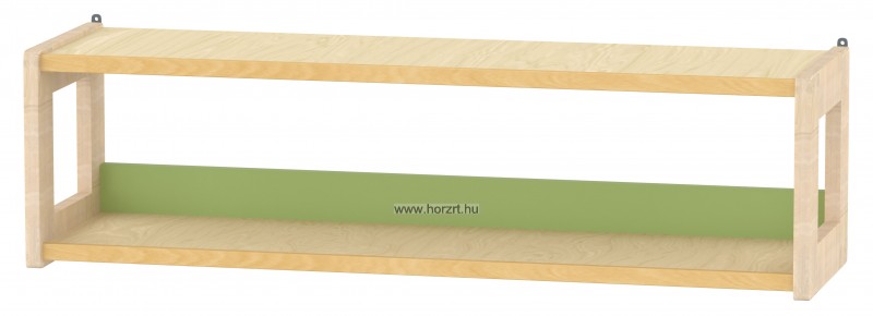 Mérete :90x24x24 cm, Anyaga: laminált bútorlap - keményfa élzárással, tömörfa kerettel. A falipolc stílusa tökéletesen illeszkedik a hozzá illő gyermekasztallal, ülőkével és a gondozónői asztallal. Jellegzetessége az oldalakat lezáró négyszögletes , közepén lukas tömör bükkfa keret. Sarkai lekerekítettek, így rendkívül biztonságosak. Alsó és felső polcára is helyezhetőek az eszközök.Színe: Juhar színű polcok -zöld hátoldal és bükk lakkozott fa keret.