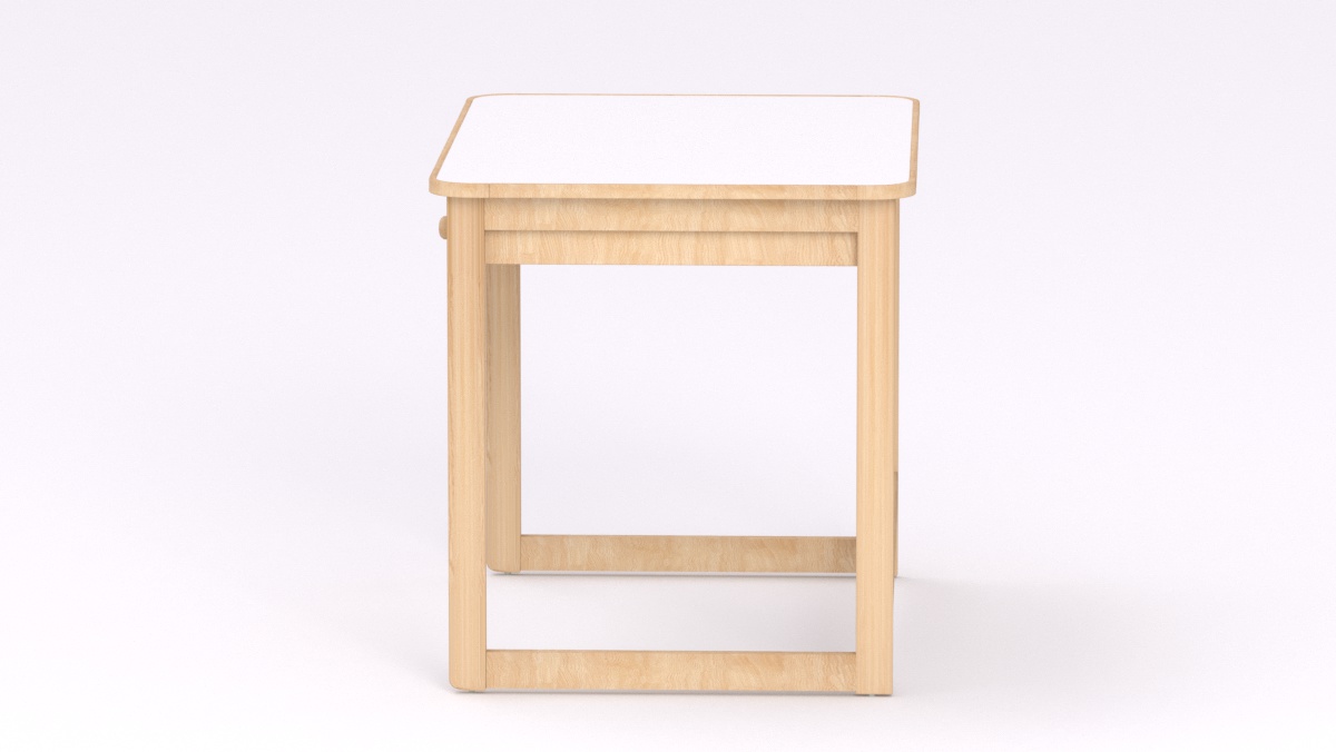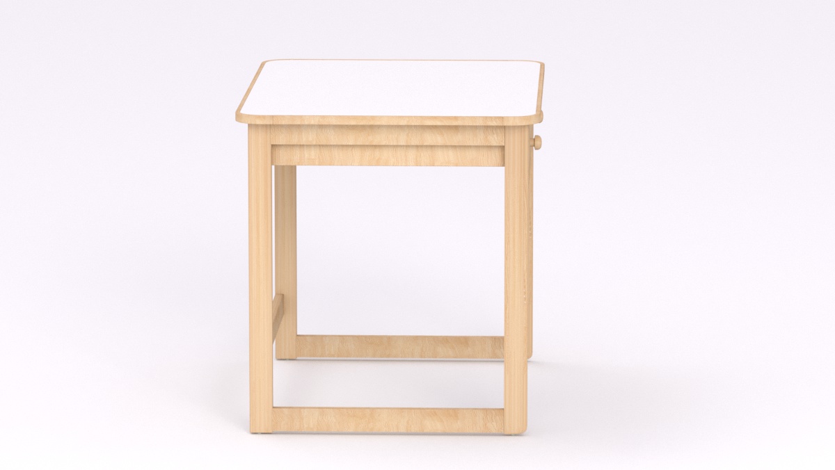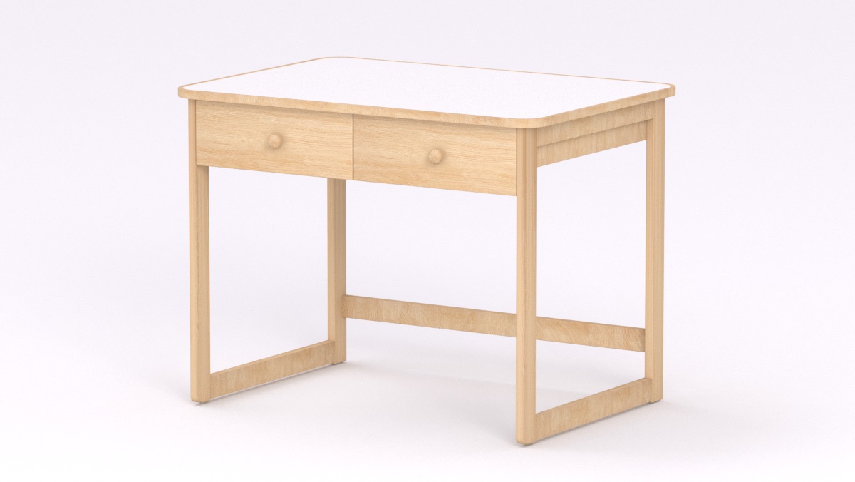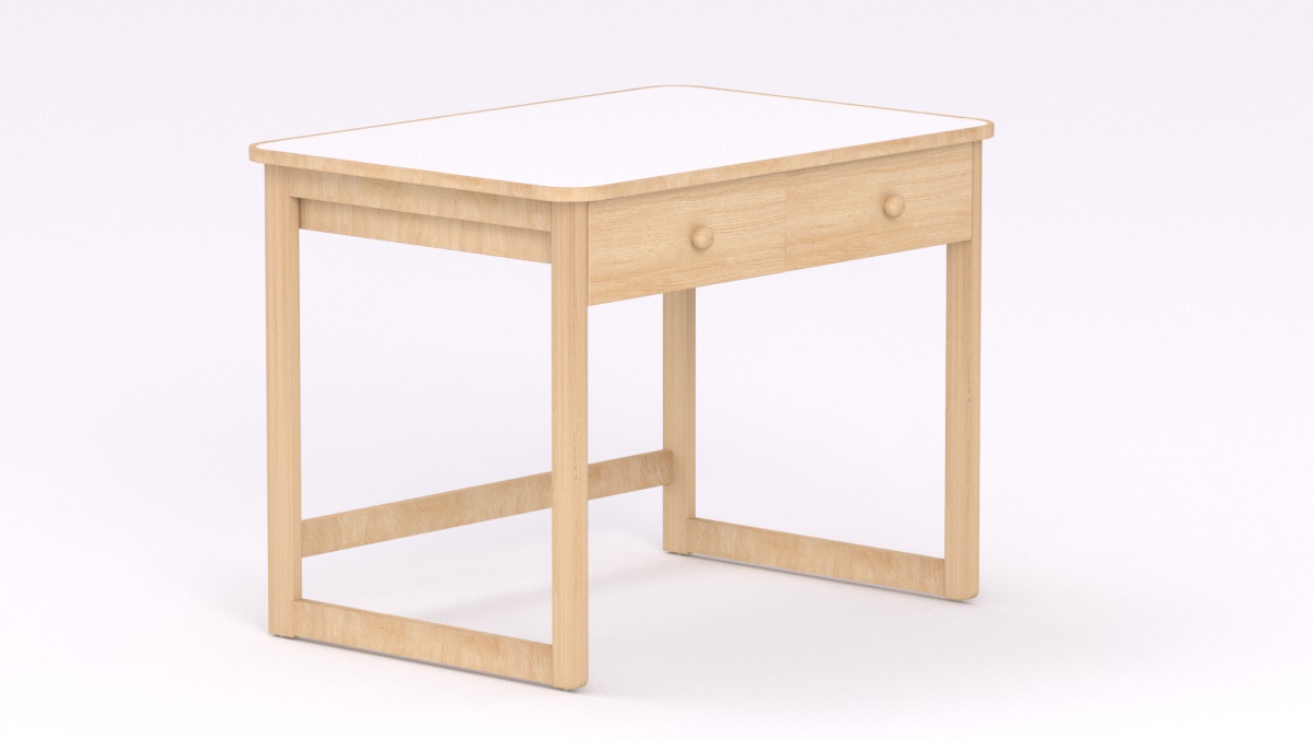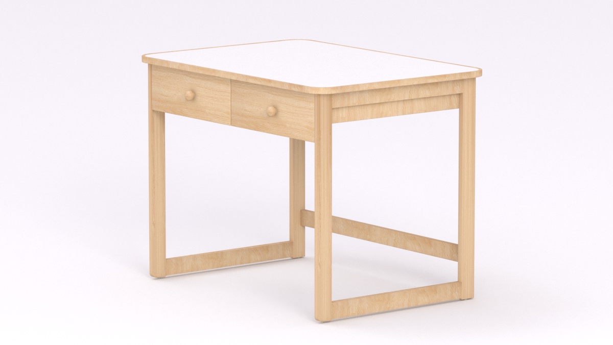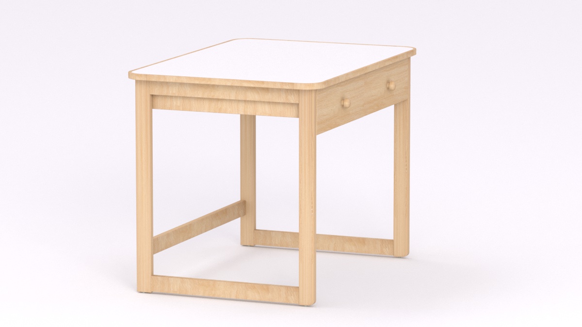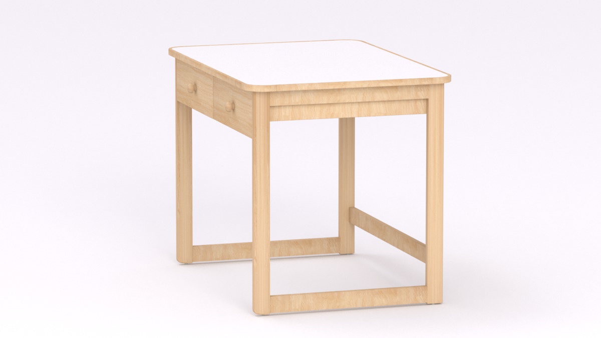 Mérete: 92x65x70 cm - 2 fiókos, Az asztal sarkai lekerekítettek, stílusa megegyezik a gyermek asztallal és ülőkével. Tömörfa lábai nyitott keretet alkotnak oldalról és hátulról is, így a kisgyermeknevelők kényelmesebben tudják használni és szellősebbé teszi a csoportszobát.