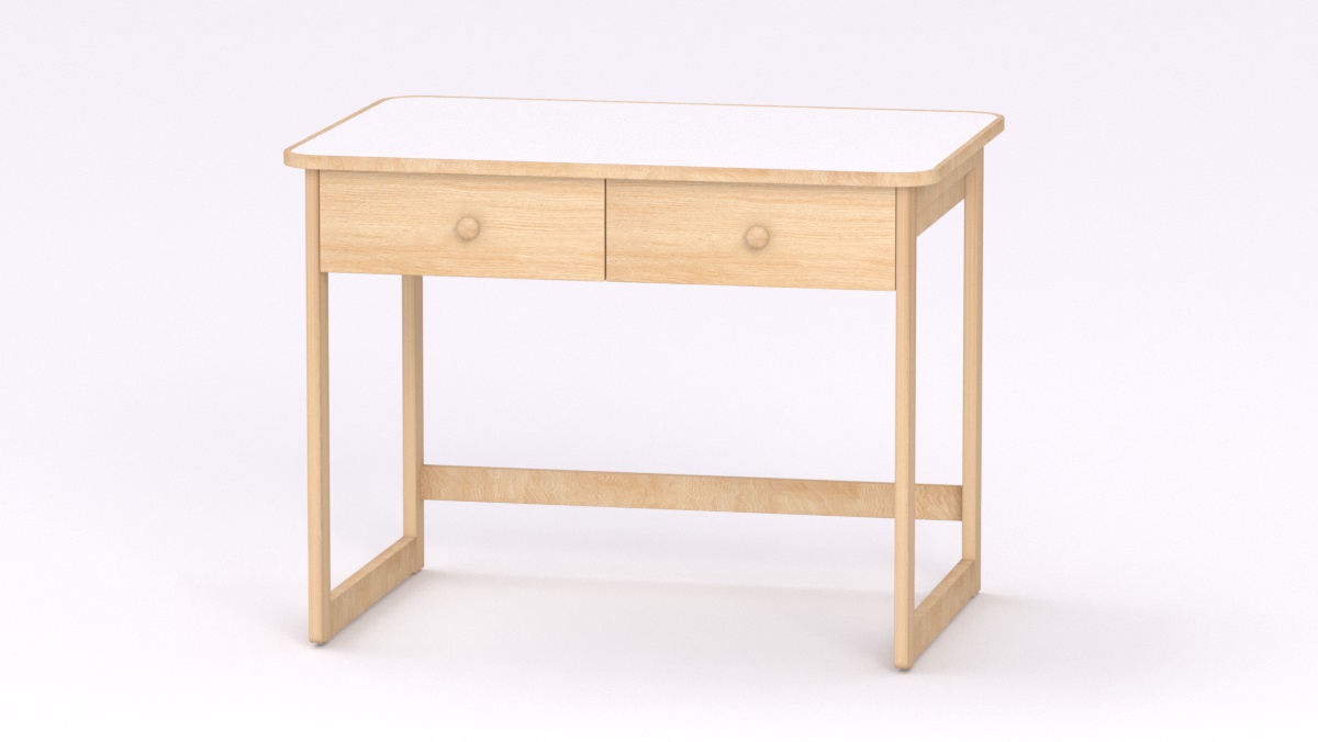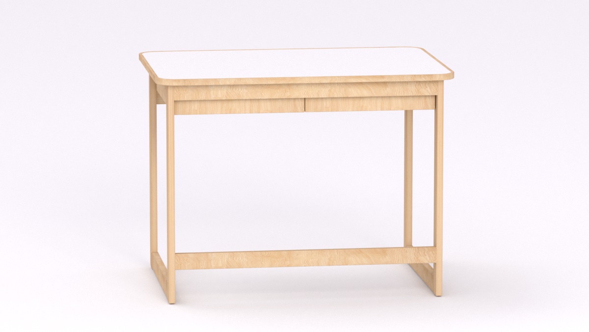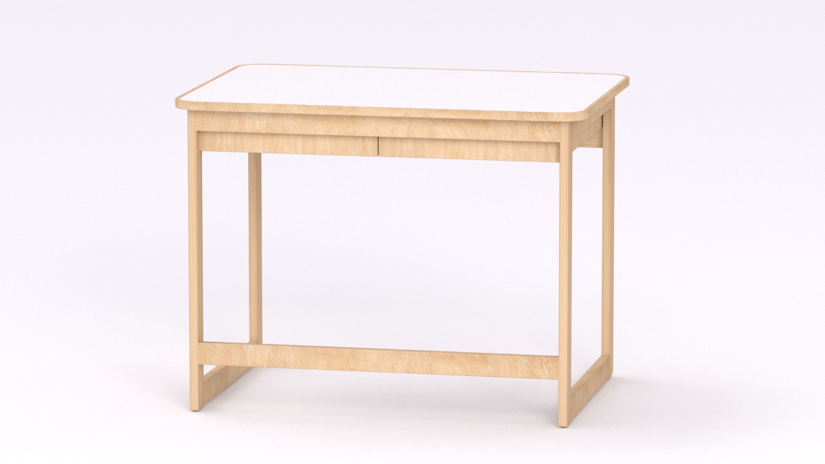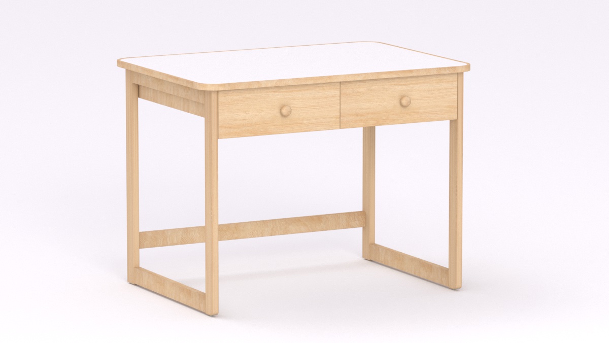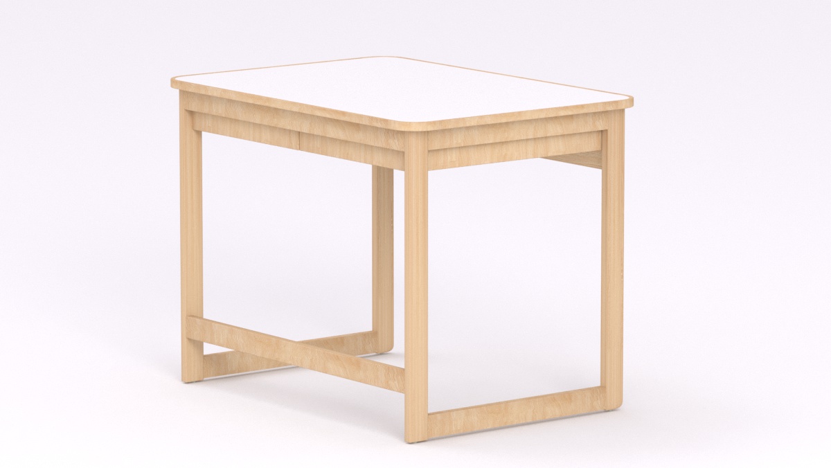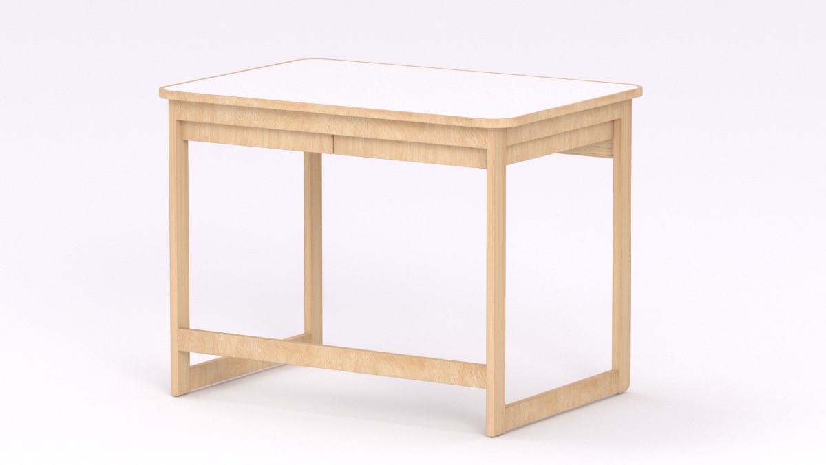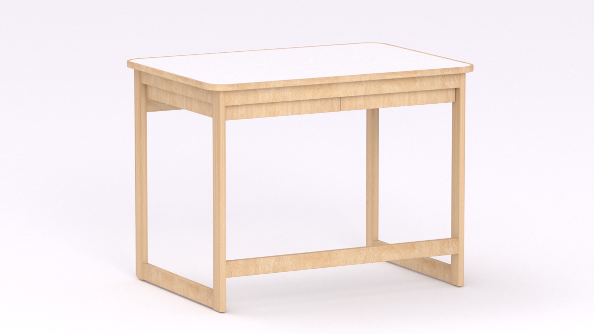 Mérete: 92x65x70 cm - 2 fiókos, Az asztal sarkai lekerekítettek, stílusa megegyezik a gyermek asztallal és ülőkével. Tömörfa lábai nyitott keretet alkotnak oldalról és hátulról is, így a kisgyermeknevelők kényelmesebben tudják használni és szellősebbé teszi a csoportszobát.