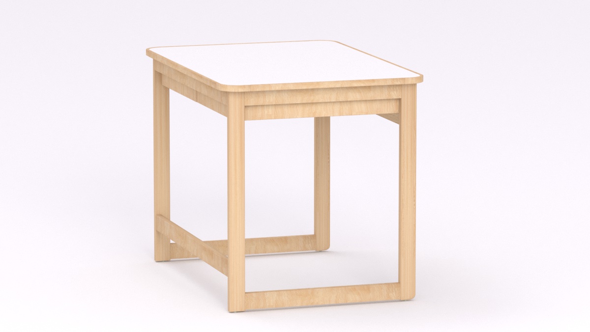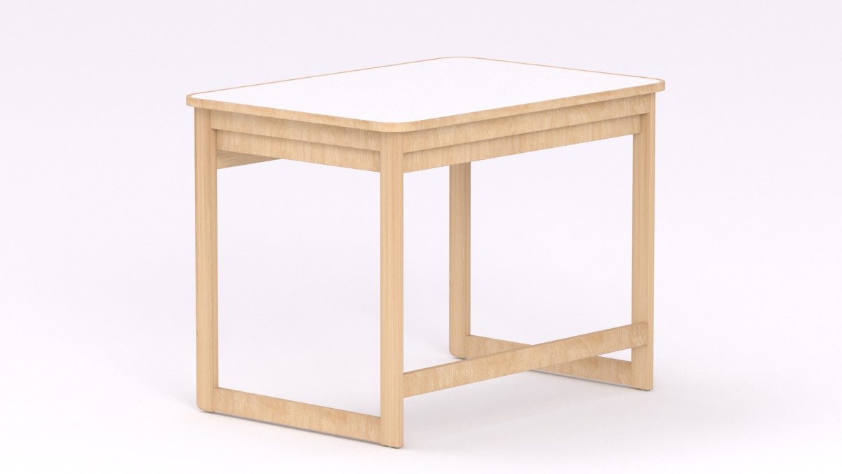 Anyaga: Asztallap: Fehér laminált bútorlap lekerekített élzárással, Lábazat: bükk, lakkozott tömörfa keretes lábbal
