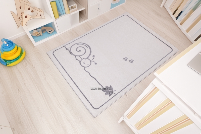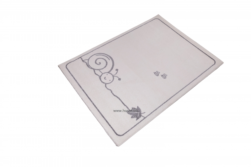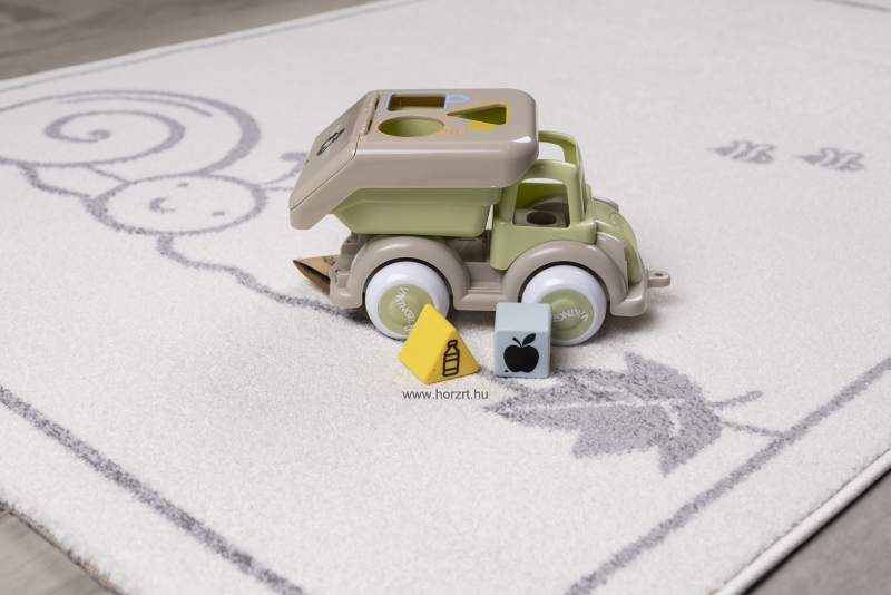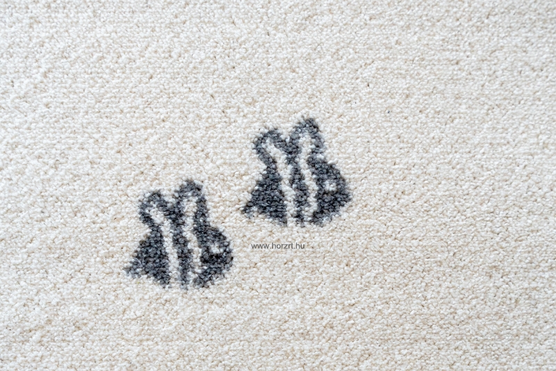 A szőnyeg alapja világos krémszínű, a minta szürke kontúros.
