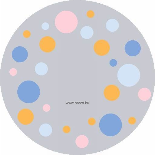 Kellemes, szürke alapszínű körszőnyeg, mely tele van színes pöttyökkel.
