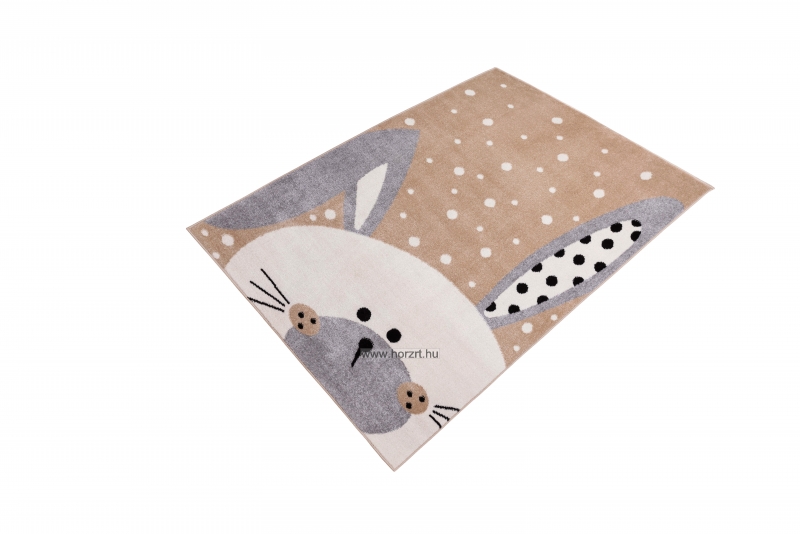 Kellemes, bézs alapszínű szőnyeg, mely tele van fehér pöttyökkel, a szőnyeg közepén pedig egy kedves kis kajla nyuszi található.