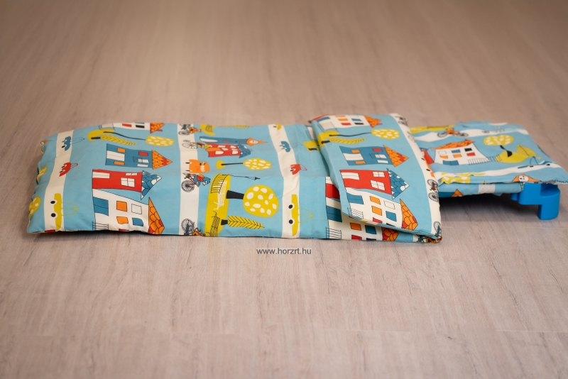 Bölcsődei vászonlepedő - városos - kék, sarokgumis