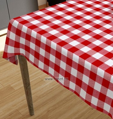 Puha pamutvászon abrosz, piros színben. Az abrosz erős textil anyagból készült, az intézményi mindennapos használatra megfelelő. Szegélye beszegett, mosógépben mosható, könnyen vasalható. Mintája élénk piros alapon fehér kockás. Téglalap alakú, mérete 80x140 cm.