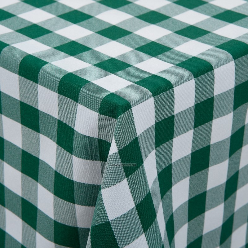 Puha pamutvászon abrosz, zöld színben. Az abrosz erős textil anyagból készült, az intézményi mindennapos használatra megfelelő. Szegélye beszegett, mosógépben mosható,könnyen vasalható. Mintája élénk zöld alapon fehér nagykockás. Szabályos négyzet alakú, mérete 120x120 cm.