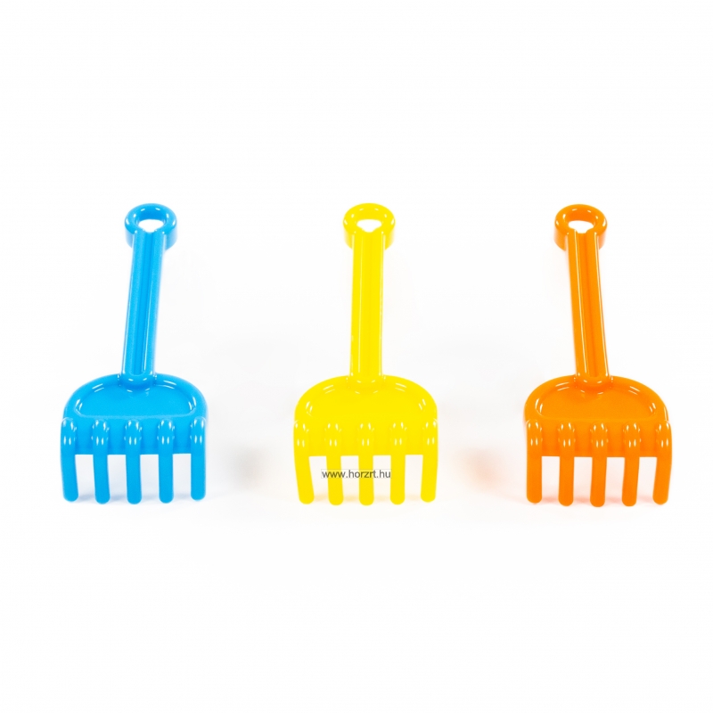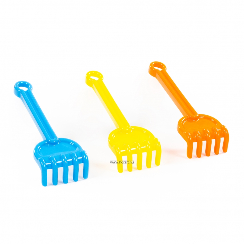 Kellemes tapintású, lekerekített, színes homokozógereblye.