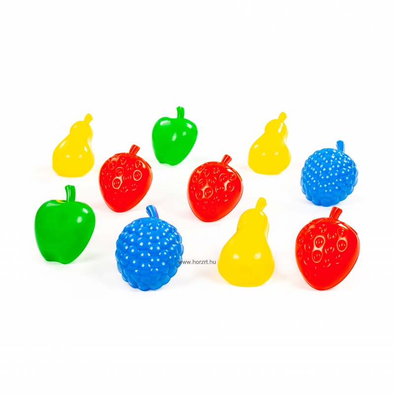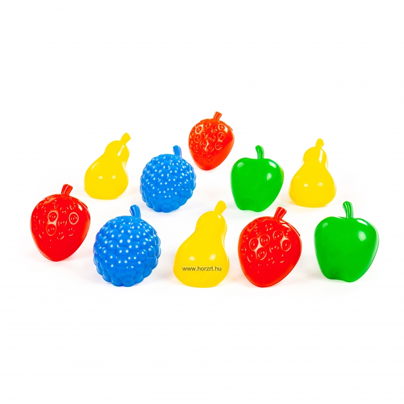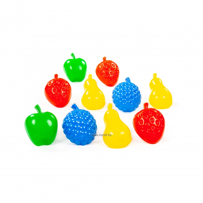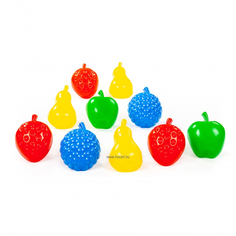 A 10 darabos színes készlet tartalma 3 db körte, 2 db alma, 3 db eper, 2 db szeder