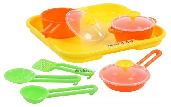 A 10 darabos készlet tartalma: - 1 db tálca - 1 db lábas - 1 db serpenyő - 1 db nyeles lábas - 3 db fedő - 3 db kiszedő (merőkanál, spatula, kiszedő) - mindegyik nyelén kis kampóval, hogy fel lehessen őket akasztani a babakonyhában