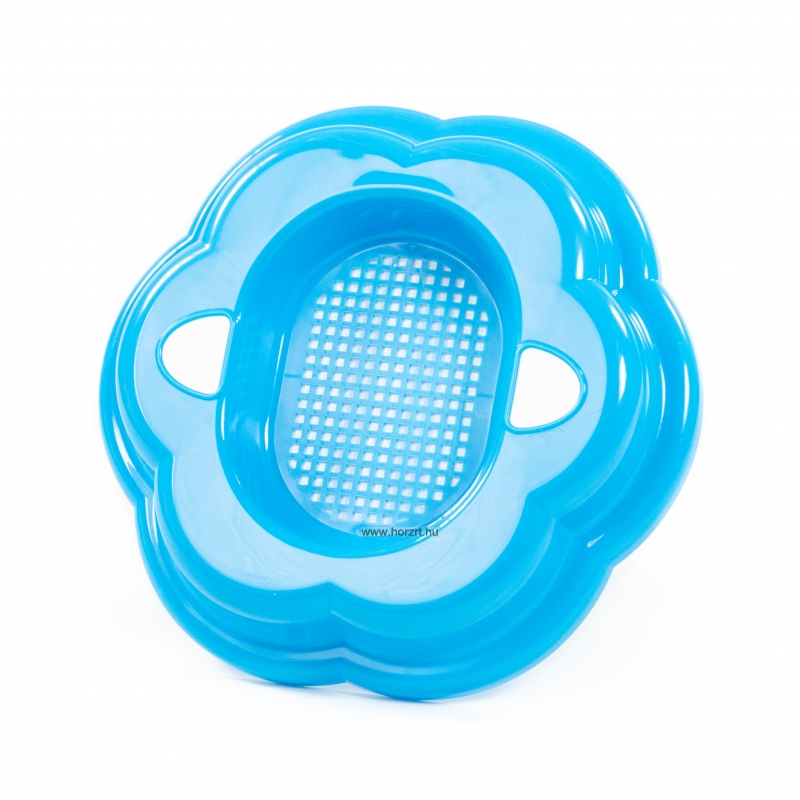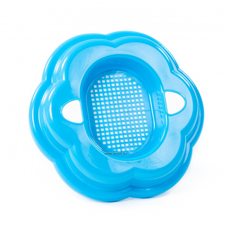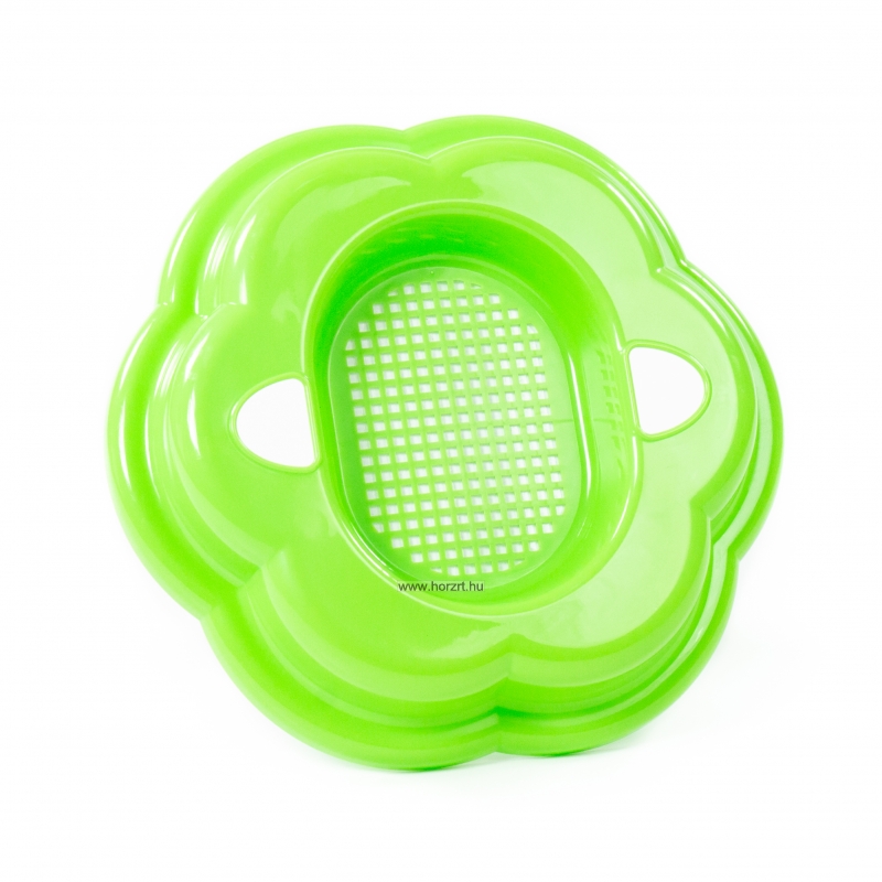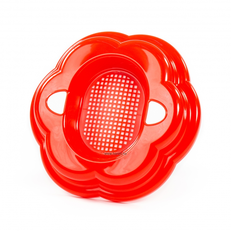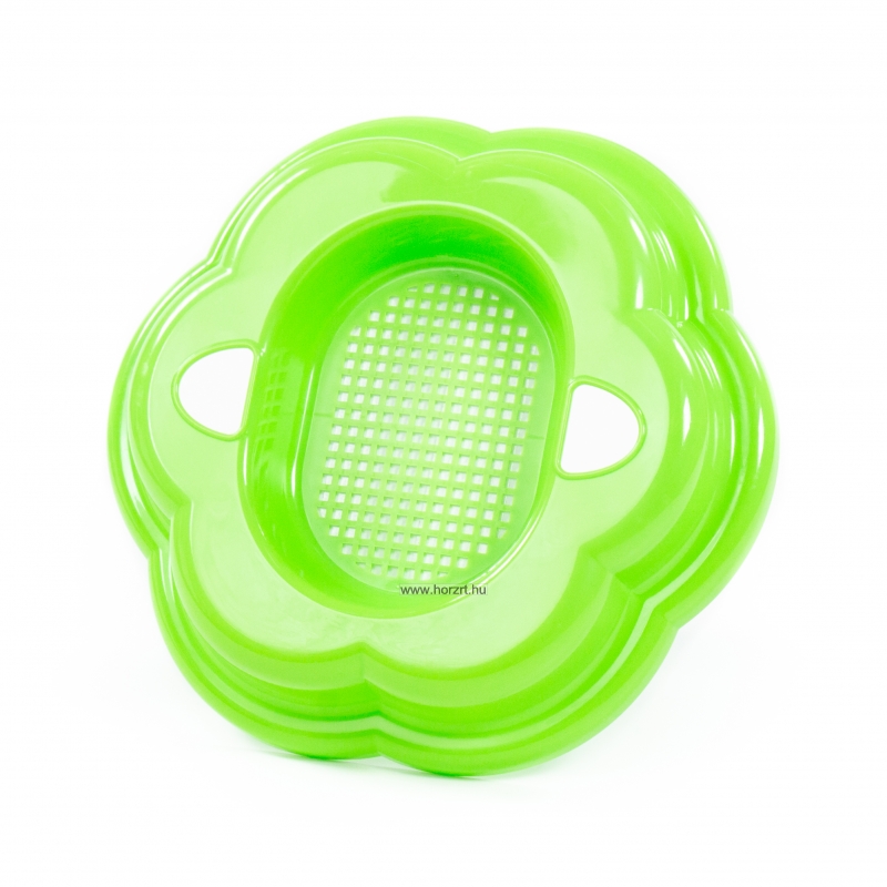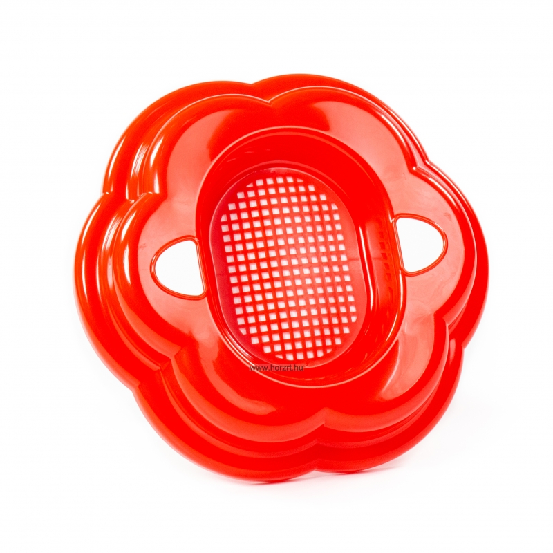 Ívelt kialakítású, praktikus méretű, masszív és tartós műanyagból készült homokozószita, virág formájú.
