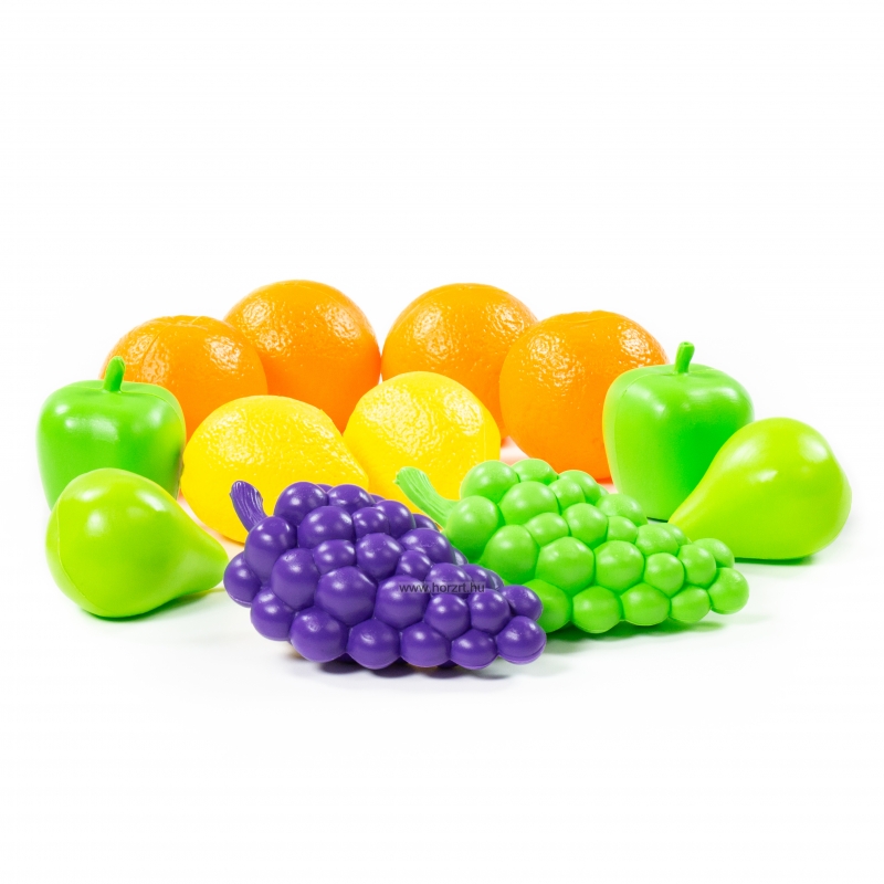 A 12 darabos színes készlet tartalma: 2 db citrom, 4 db narancs, 2 db körte, 2 db alma, 2 db szőlő