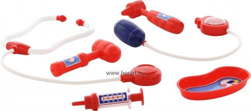 A 6 darabos készlet tartalma: - 1 db sztetoszkóp - 1 db reflex kalapács - 1 db fecskendő - 1 db fül vizsgáló - 1 db vérnyomásmérő - 1 db tálka Orvos-beteg szerepjátékokhoz ajánljuk.