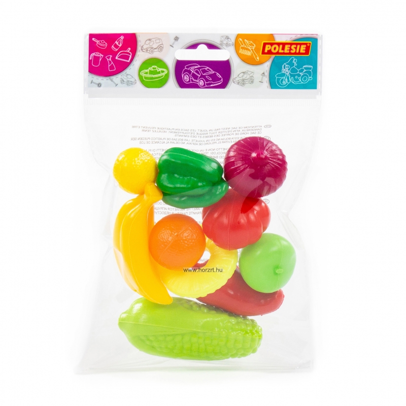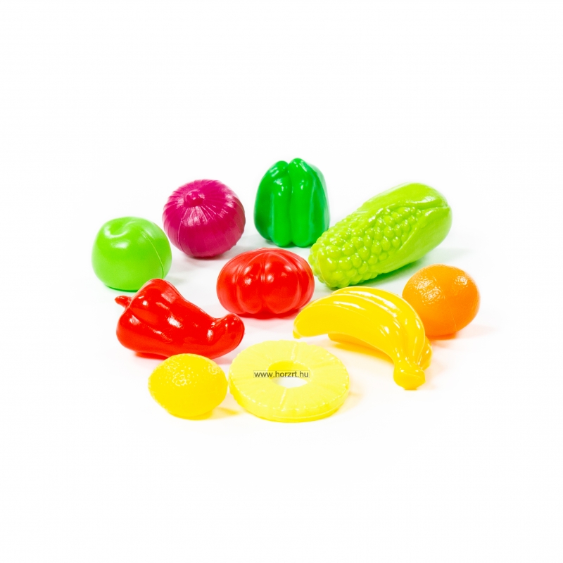 A színes, műanyag készlet 10 kisebb méretű gyümölcsöt és zöldséget tartalmaz: 1 db banán, 1 db paradicsom, 1 db citrom, 1 db narancs, 1 db lilahagyma, 1 db zöldpaprika, 1 db alma, 1 db piros paprika, 1 db kukorica, 1 db ananászkarika.
