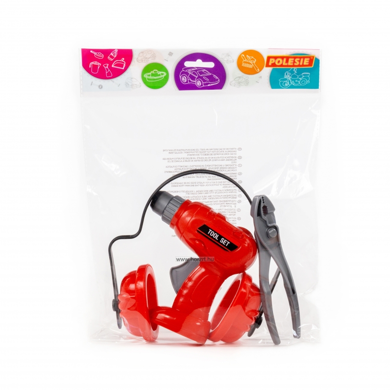 A színes játék fúrókészlet tartalma 1 db fúrógép fúrószárral, 1 db harapófogó, 1 db fülvédő