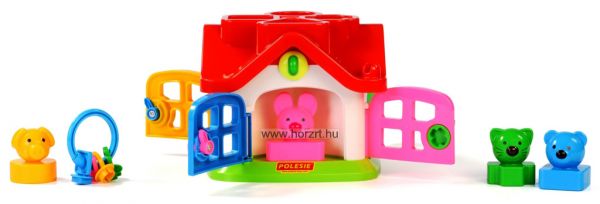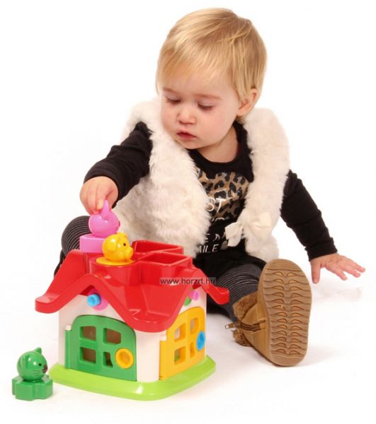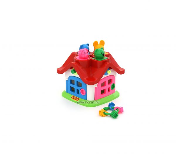 Tartalma: - 4 db figura formabedobó (sárga-kör-malac, rózsaszín-háromszög-egér, zöld-kereszt-cica, kék-négyzet-mackó) - 1 db kulcskarika 4 különböző színű és formájú kulccsal - 1 db formabedobó házikó, tetején 4 formabedobó nyílással, oldalain 4 nyitható ajtóval, az ajtók felett egy-egy gombbal. Az ajtók felett lévő gombokat egyenként négy különféle mozdulattal kell elmozdítaniuk (gomb benyomásával, kihúzásával, elcsavarásával vagy lenyomásával), hogy az állatkák beleessenek a házikóba. Nem csak szín- és formafelismerő, formabedobó, de még finommotorikus mozgást is fejlesztő játék. 2 éves korú gyermekek használatára CE minősítéssel ellátva!