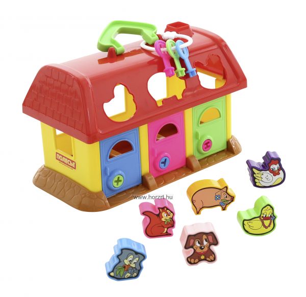 Tartalma: - 1 db kulcsos formabedobó házikó (6 különböző formájú nyílás a tetején, 3 különböző színű ajtó, melyek kinyitásához 3 különböző kulcs kell.) - 3 db kulcs egy kulcskarikán (a kulcsok színe megegyezik a zár színével. - 6 db állatka forma (nyuszi, mókus, kutya, malac, kacsa, tyúk) - 1 db matrica készlet. Nem csak formabedobó játék, hanem a megfelelő kulcsok megtalálása miatt, szín- és formafelismerő, valamint finommotorikát fejlesztő játék is. A ház tetején lévő fogantyút használva könnyedén odébb lehet vinni és a kulcskarikát is rá lehet fűzni. 2 éves korú gyermekek használatára CE minősítéssel ellátva!