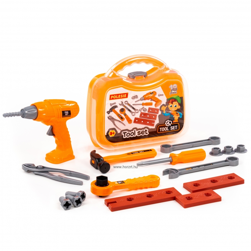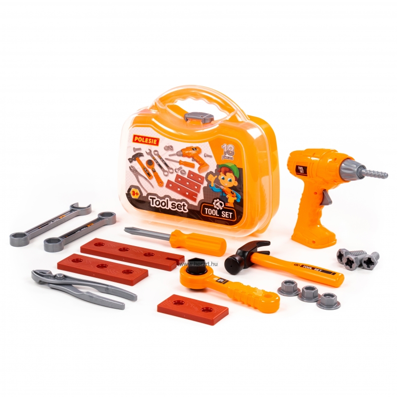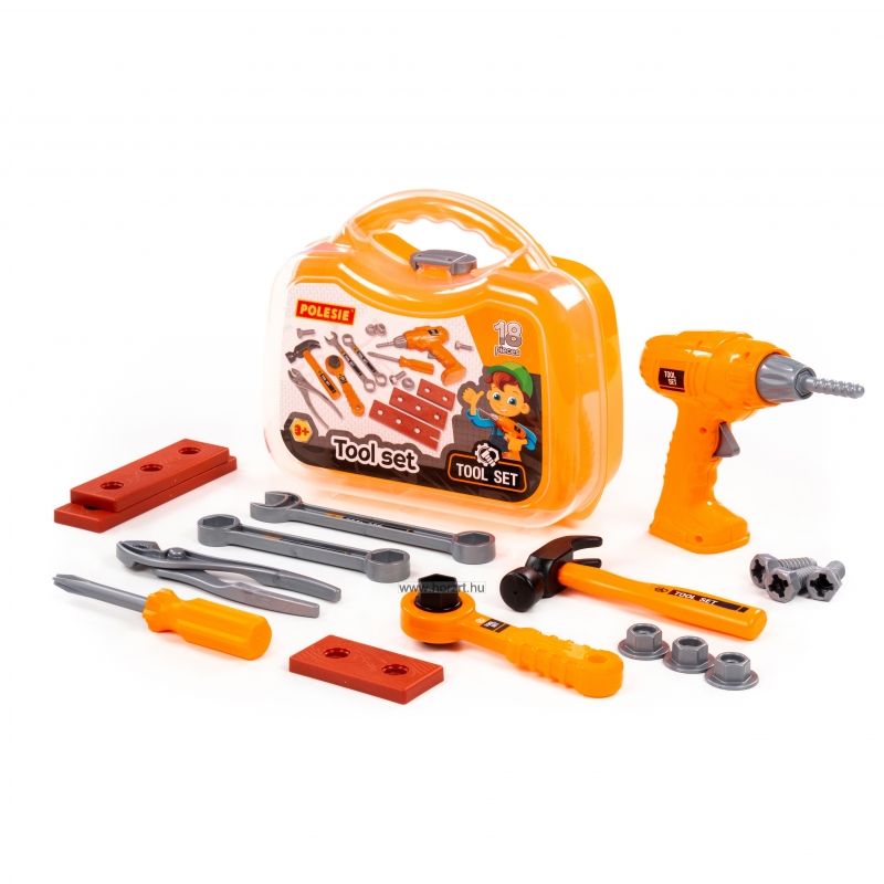 Az igényes megjelenésű, strapabíró és biztonságos kivitelezésű műanyag készlet tartalma például szerszámdoboz, fúrógép, kalapács, csavarkulcs, csavarhúzó, csavarok, csavaranyák, fogó stb.