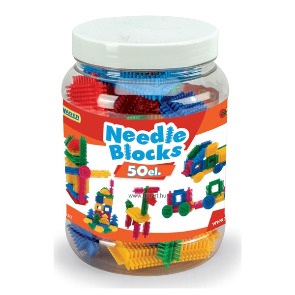 Tartalma: 50 db építőelem, különböző formákban (négyzet, hasáb, háromszög, kör, fenyőfa) és 5 féle színben, praktikus, visszazárható tetejű dobozban.