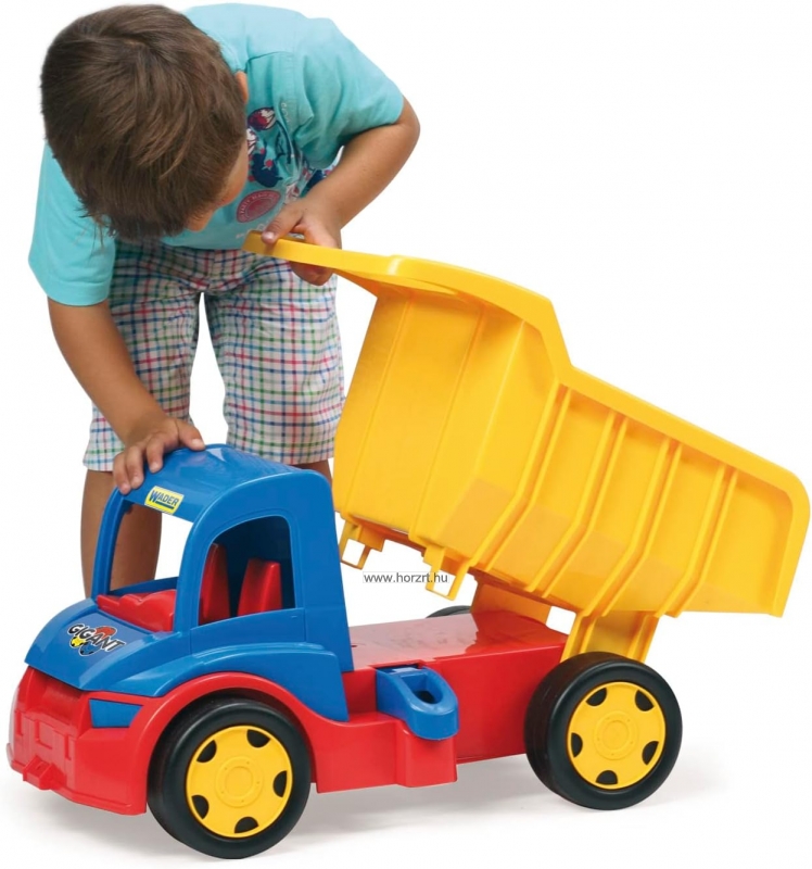 4 kerekű, strapabíró dömper, vidám színekben. A rakfelülete billenthető. Jól használható beltéren és kültéren egyaránt.