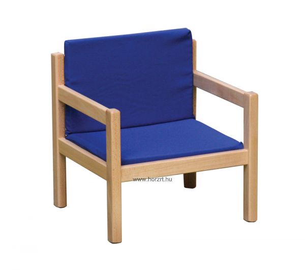 Gyermek fotel. Tömör,lakkozott bükkfa keret, textillel bevont szivacs ülőke és háttámla. Ülésmagasség 22cm. Teljes méret: 47x43x47 cm. Többféle színből választható.
