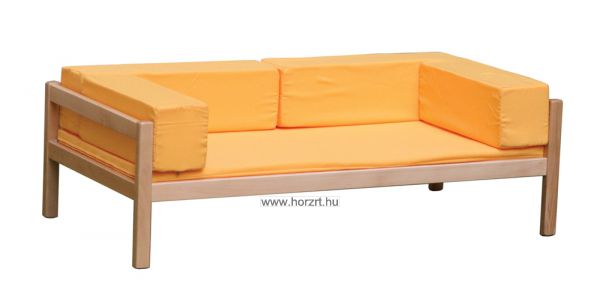 Gyermek kanapé. Tömör, lakkozott bükkfa keret, textillel bevont szivacs ülőke és párnák.