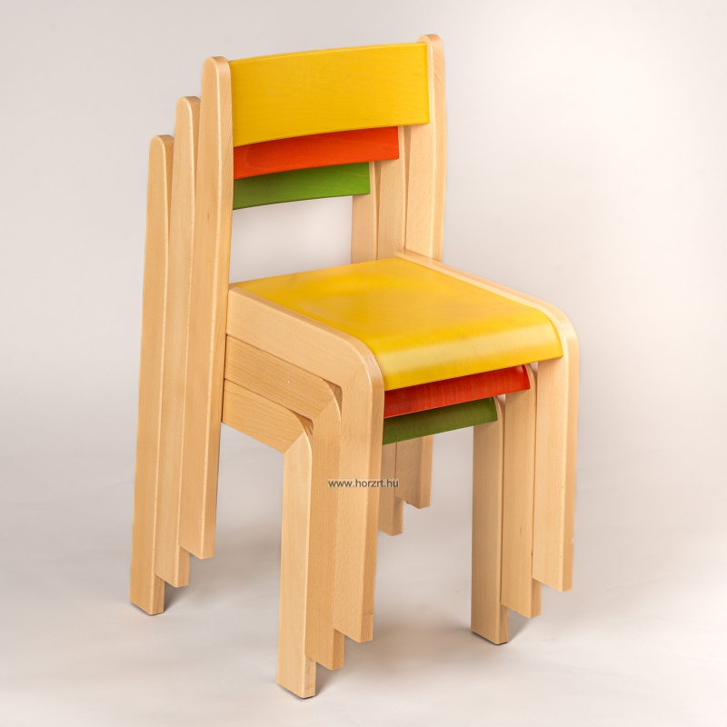 Mélyített ülése és íves háttámlája biztosítja a gyermekek helyes testtartását, egészséges fejlődését. Az ülés és háttámla rétegelt lemezből, a szék szerkezete bükkfából készül, vízbázisú, környezet- és gyermekbarát lakkal kezelve. A lábak alját műanyag csúszásgátlóval láttuk el.